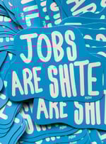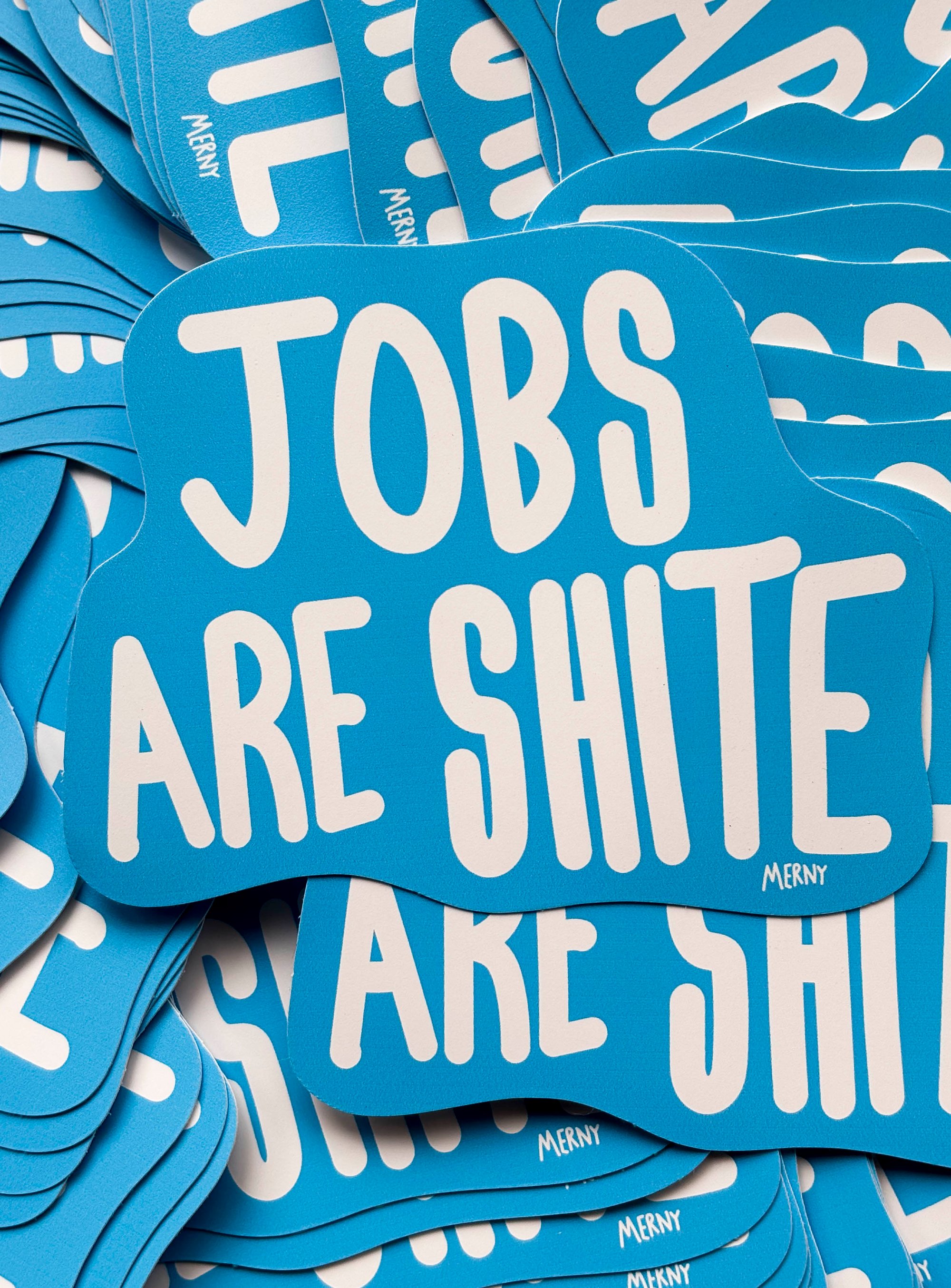 Add a splash of attitude to your stuff with this “JOBS ARE SHITE” sticker. Designed by Merny, this colourful die-cut vinyl sticker brings a pop of humour (and honesty) to your laptop, water bottle, notebook, or wherever else you fancy slapping it.
